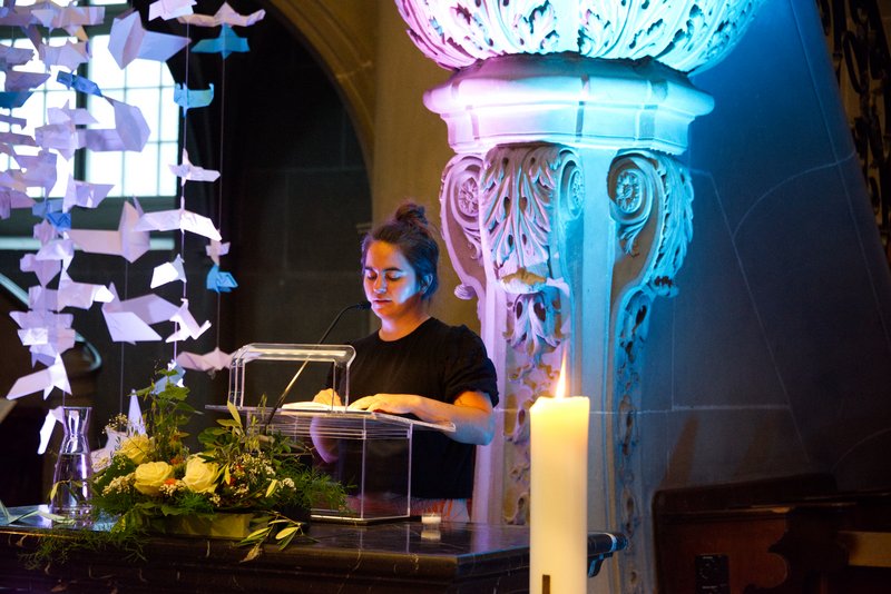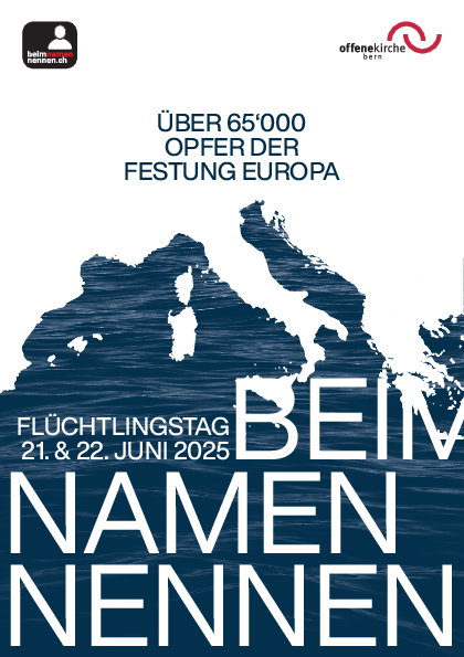 Die Aktion «Beim Namen nennen – über 65'000 Opfer der Festung Europa» gedenkt seit 2019 den Menschen, die auf dem Weg nach Europa gestorben sind und protestiert gegen ihren Tod. Am Flüchtlingstag lesen wir ihre Namen und schreiben sie auf weisse Stoffstreifen, die wir an die Fassade der Heiliggeistkirche hängen. 2021 haben wir die 44'000 Stoffstreifen zu 10 schön gebundenen Büchern zusammengenäht. www.beimnamennennen.ch<