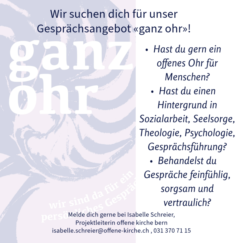 Interesse? Melde dich bei Isabelle Schreier, isabelle.schreier@offene-kirche.ch oder T 031 370 71 15