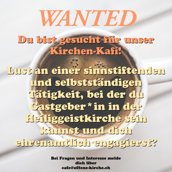 Das Café in der Heiliggeistkirche ist das Herzstück der Kirche. Als freiwillig engagierte Person bist du häufig erste Ansprechperson für Menschen, die in die Kirche kommen und stellst sicher, dass die offene kirche überhaupt offen sein kann. Du bist Gastgeber*in der Kirche und servierst verschiedensten Menschen Kaffee, Tee oder Orangensaft – Menschen, die am Rand der Gesellschaft leben, Menschen mit Migrationshintergrund, einsamen Menschen, Tourist*innen und Passant*innen.